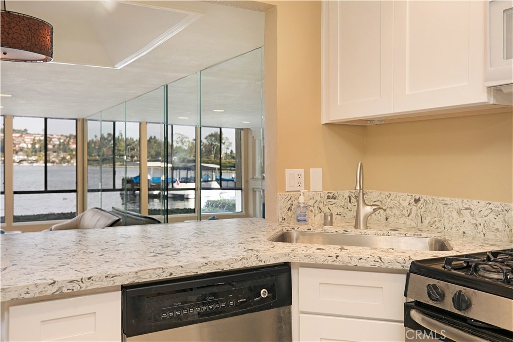 Absolutely gorgeous, remodeled lakefront two bedroom condo on Lake Mission Viejo. Functional floor plan with large living room, formal dining room, kitchen with breakfast nook and inside laundry closet, a master suite with walk-in closet and second bedroom with hall bathroom. Sweeping lakefront big water views from almost every room! Kitchen has been beautifully remodeled with brand new Quartz slab counter-tops and beautiful new cabinetry! Both bathrooms are remodeled with travertine and custom fixtures including spa tub. Large living room with fireplace and blue, blue, blue water views as you sit and enjoy the lake! Includes 1 garage and 1 carport, central heat and air, fireplace and much more! Also has a gated front patio and gated rear patio with door which opens to the lakefront. Finisterra on the Lake is a gated lakefront community with private beach, pool, greenbelts, fishing dock, boat slips and drydock boat parking. Enjoy all that Lake Mission Viejo has to offer including private beaches, boat rentals, summertime concerts, holiday events and the grand Fourth of July fireworks display!