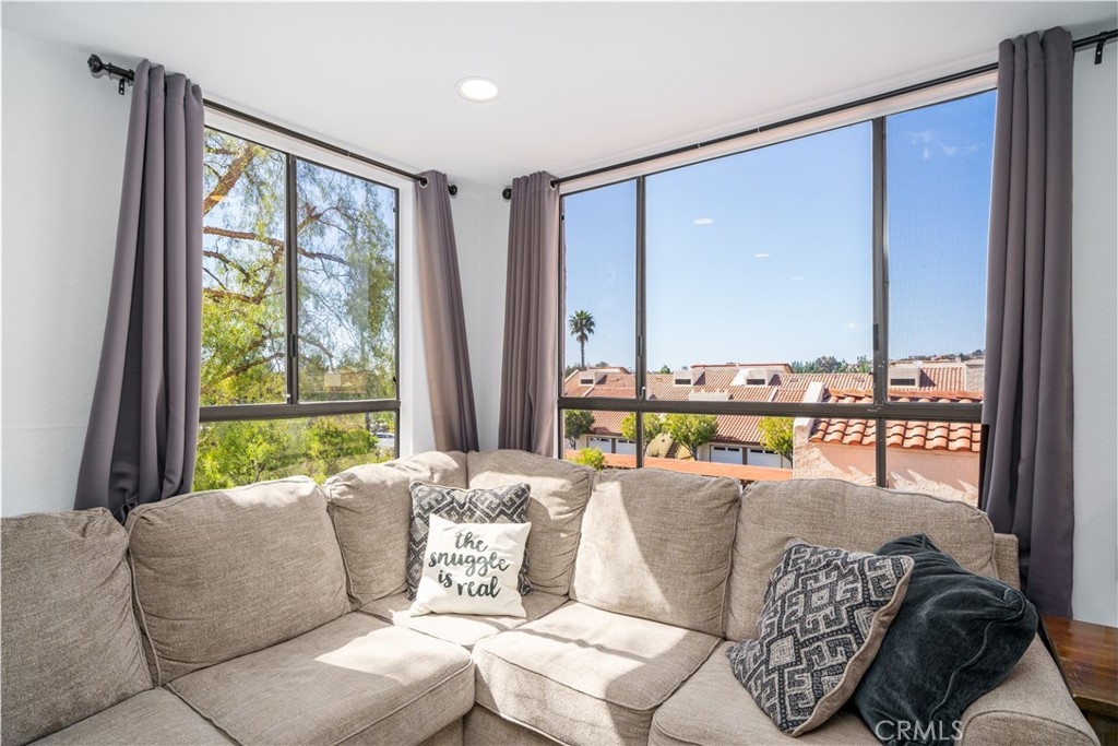 Very desirable and updated end unit condo in Finesterra on the Lake. The property features a 1 car detached garage with direct access to the front door. This modern looking unit has been updated with neutral gray laminate flooring throughout and quartz counter tops. Lots of extra pantry storage in the kitchen which includes a small breakfast eating area and formal dining area. Walk in shower and closet off of the oversized Master Bedroom, second bathroom features a generous sized tub. Beautiful View from the Living Room and balcony area of wonderful Lake Mission Viejo which residents have access to!