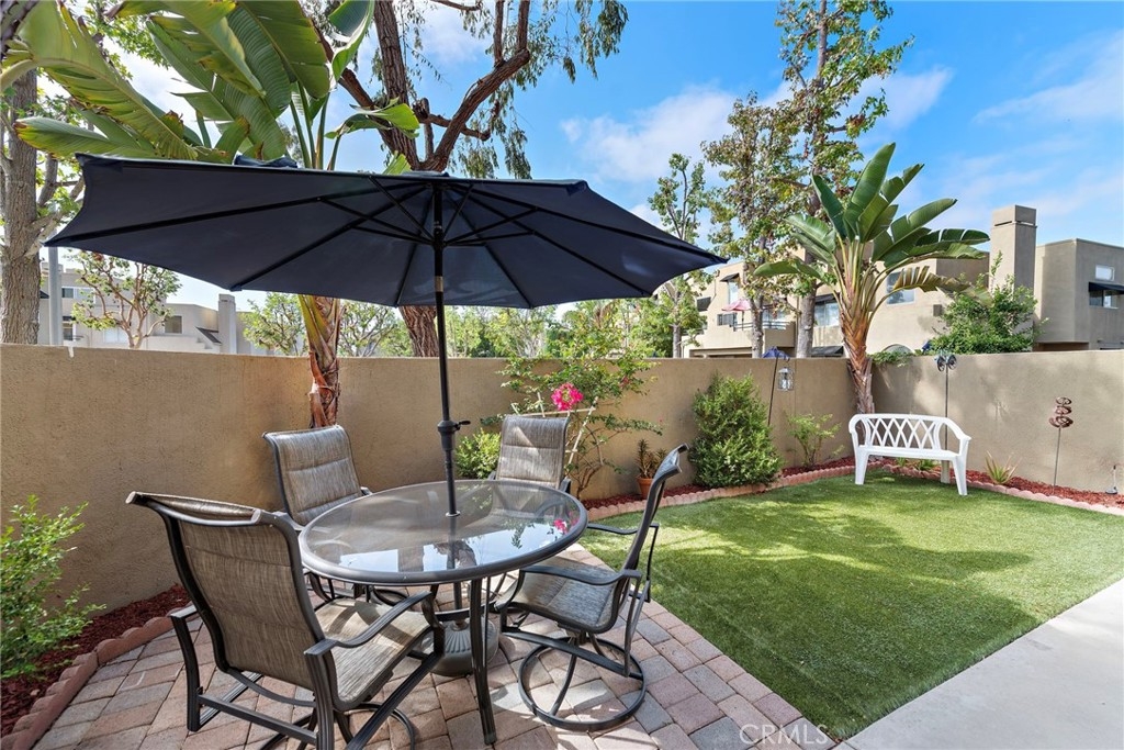 Welcome to this amazing two-bedroom condo with an expansive enclosed backyard, located in the desirable community of Rainbow Ridge. This ground-floor, single-level residence boasts an open floor plan with abundant natural light. The home has been thoughtfully upgraded with recessed lighting, premium vinyl flooring throughout, neutral paint, raised baseboards, crown molding, and more. The spacious living room features a cozy gas fireplace, and opens to the private, spacious backyard. The updated kitchen is complete with Quartz countertops, subway tile backsplash, stainless appliances, and direct access to the one car garage. The large primary bedroom offers a walk-in closet, a double-sink vanity separate from the main bathroom, and plenty of additional storage space. The remodeled bathroom includes granite countertops and beautiful walk-in shower. The second bedroom is perfect for use as an office, bedroom, or den. Enjoy entertaining in the generously-sized, enclosed yard, featuring large covered patio area, brick paver area perfect for an outdoor dining, and turf area. Rainbow Ridge offers its residents fantastic amenities, including a tot lot, two community pools/spas, sport court, and membership to Lake Mission Viejo.