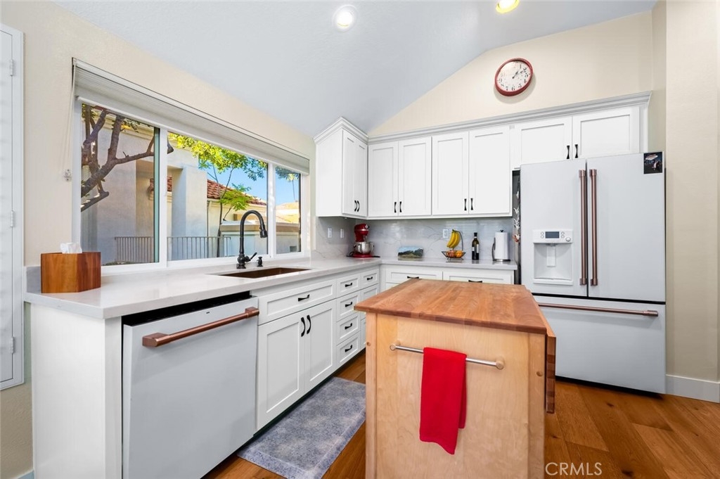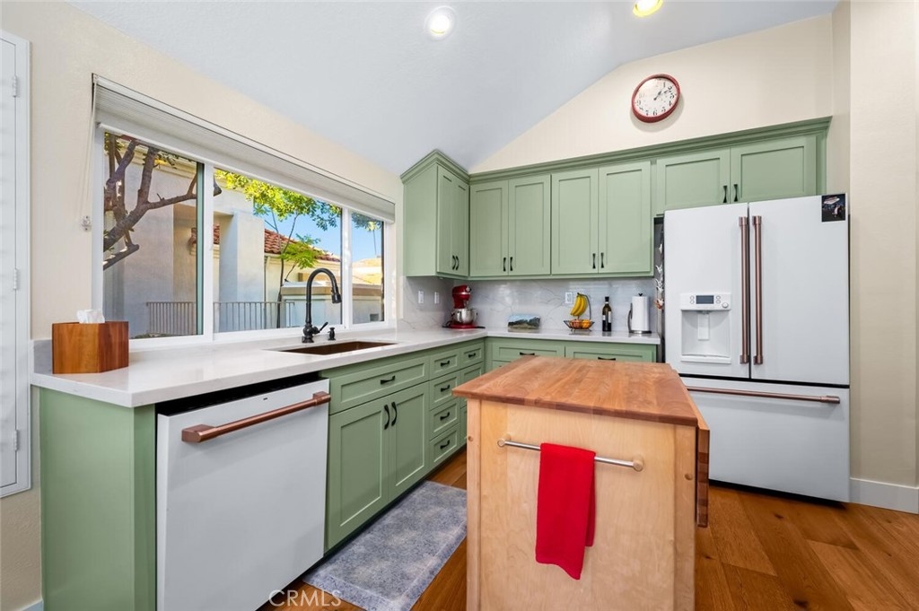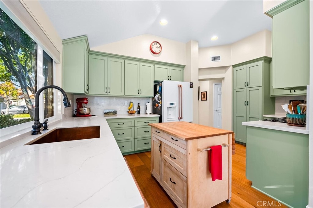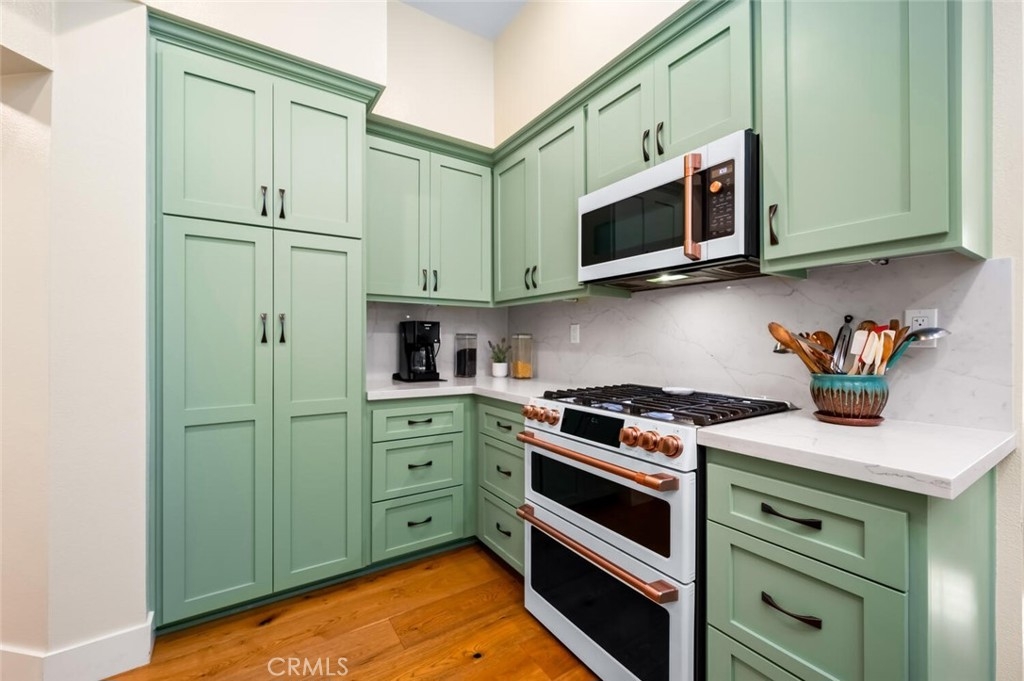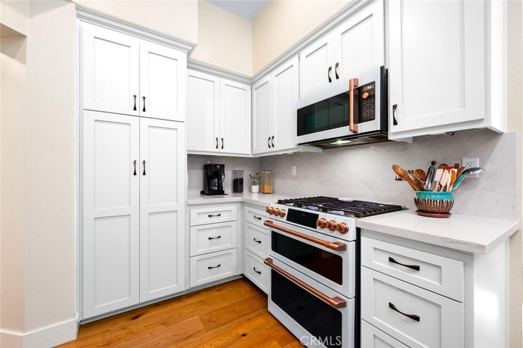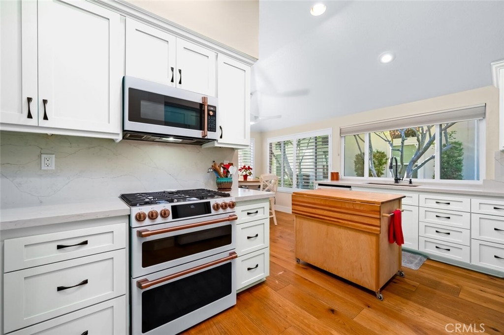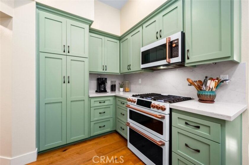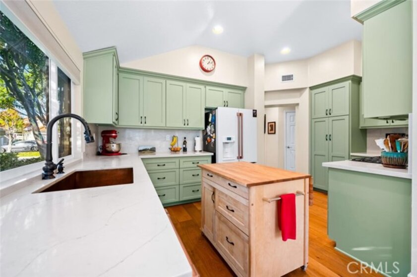 One of our favorites and soon to be yours within the 55+ Palmia community! Single Level, Two Bedroom PLUS Den/Office & Two Full Baths. This one is a Charmer with a Delightful Location and Fabulous Floor Plan. Entry way leads to a Great Room with Vaulted Ceilings and an Updated floor to ceiling Fireplace surround. Office/Den (no closet or door but could be added) is toward front of home with Bedrooms on opposite wings. Home features a FABULOUS REMODELED Kitchen with newer cabinetry, Quartz countertops, and GE appliances with Upgraded copper handles. Kitchen has a charming Nook for dining, Soft close Cabinetry, Light and Bright with several Windows overlooking the Greenbelt. Beautiful French Oak hardwood flooring, Plantation Shutters, and Ceiling Fans adorn the home. Decorator Wall in Secondary Bedroom. Primary Bedroom has Patio Access and also a REMODELED Ensuite bath - Walk in Closet, Dual Vanities and Shower. Both bedrooms have closet organizers to maximize the space. The Yard features areas for planting, dining and enjoying the outdoors. Patio Wall was built higher for added privacy and there is a gate direct for easy access to Greenbelt. The 2-Car Garage has an extended area for Washer/Dryer, Built in Cabinetry and Epoxied garage floor. Additional features include hideaway screen at front door, the home has been re-piped, newer water heater, newer heating/air conditioning units and Air ducts. Residents enjoy the Palmia Amenities including Clubhouse, Fitness Center, 3 Swimming Pools/Jacuzzi's, 18-hole Putting Green, Pickleball and Tennis Courts, Bocce, Shuffleboard +++. Mission Viejo Lake is also part of the Homeowners Association Amenities. This home is FABULOUS!